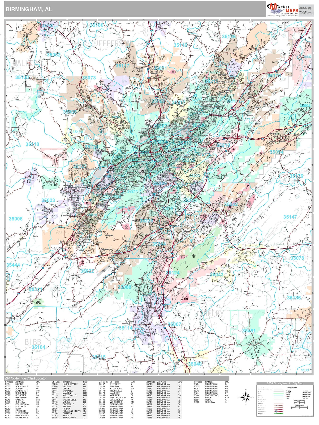 Birmingham Alabama Zip Code Wall Map (Red Line Style) by